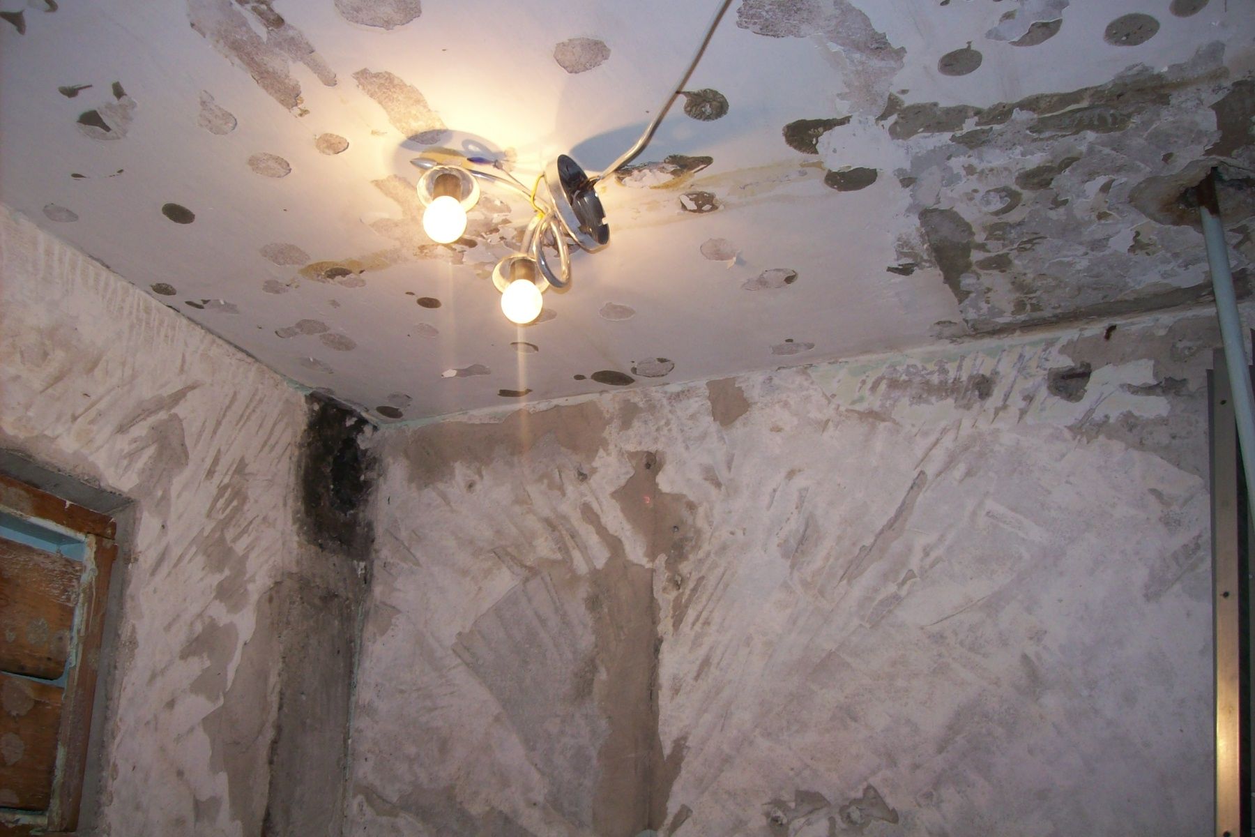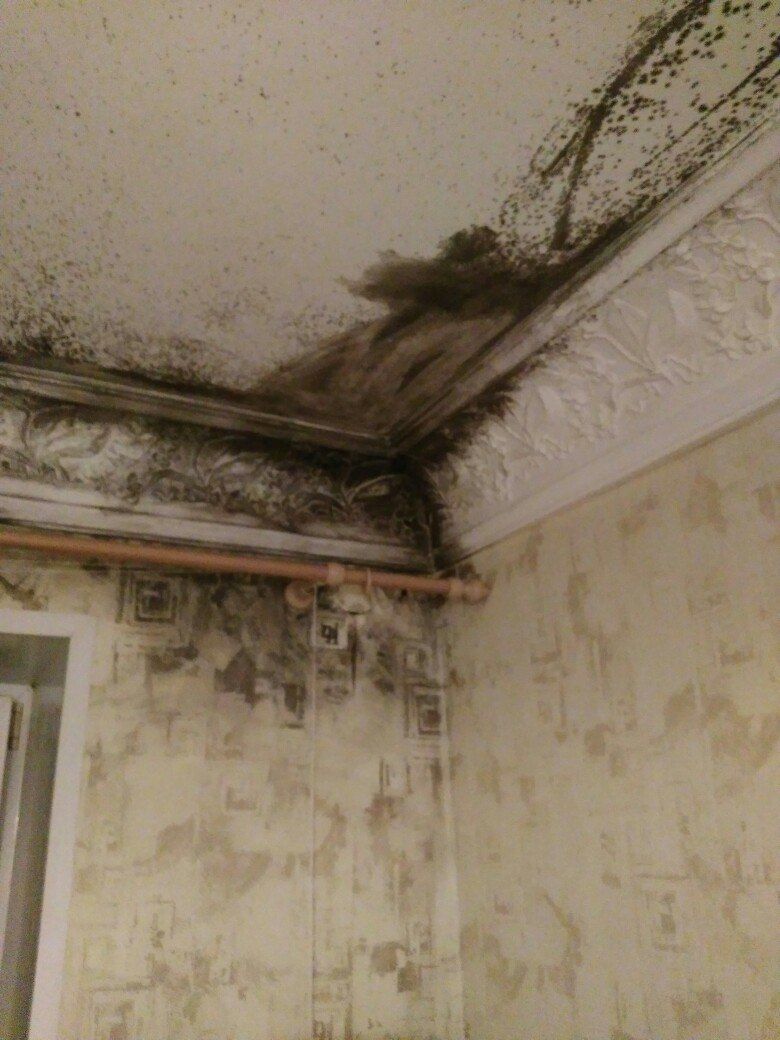 - Обнаружив все места где есть плесень необходимо обильно смочить участок водой, для предотвращения высевания спор в воздух при зачистке